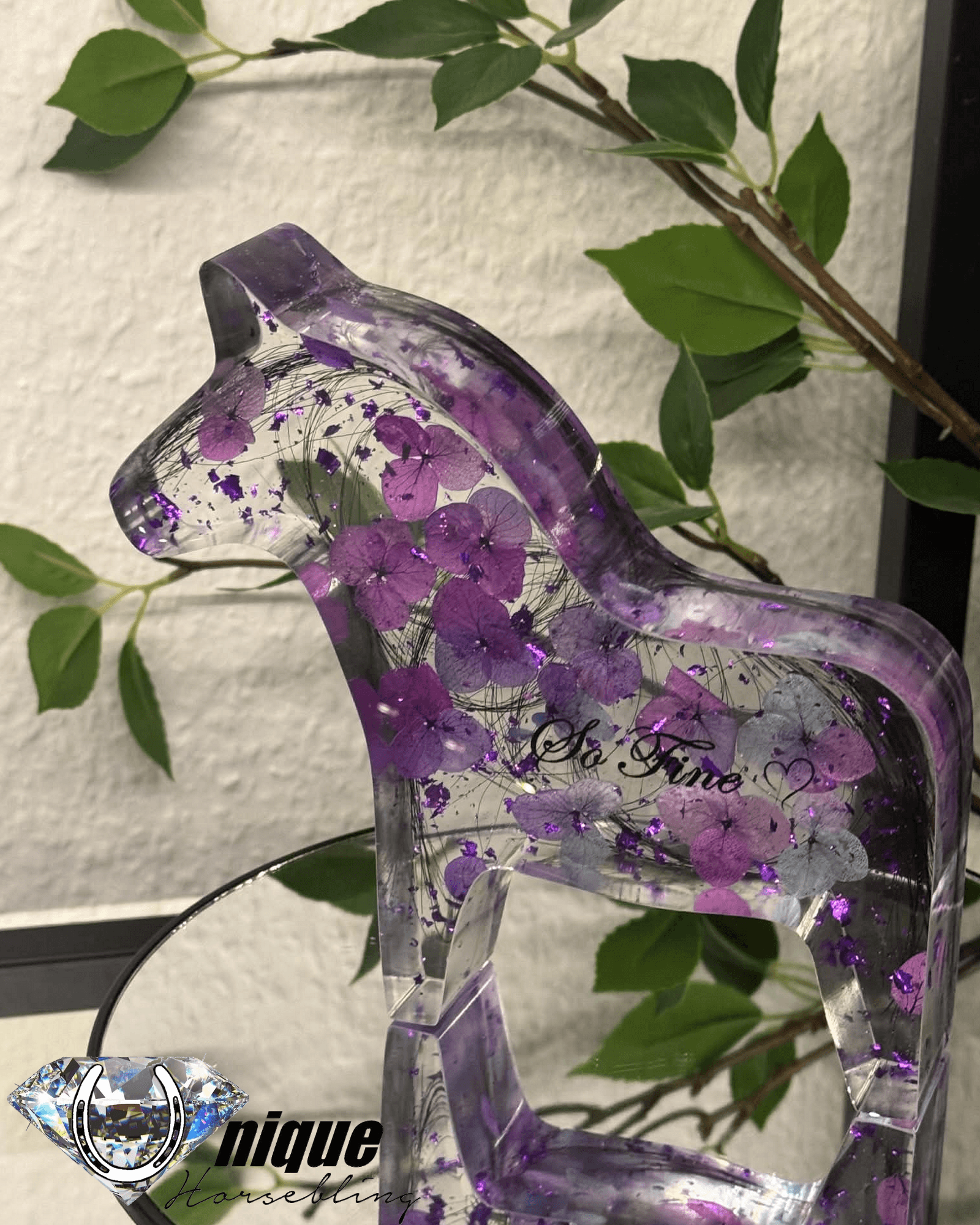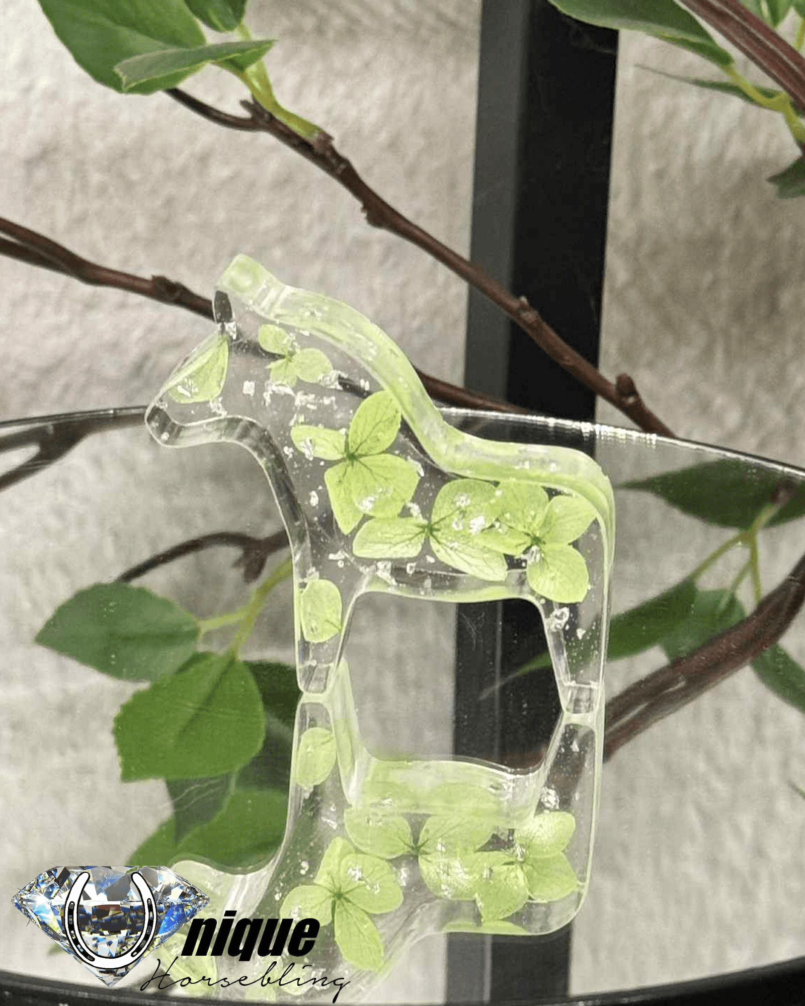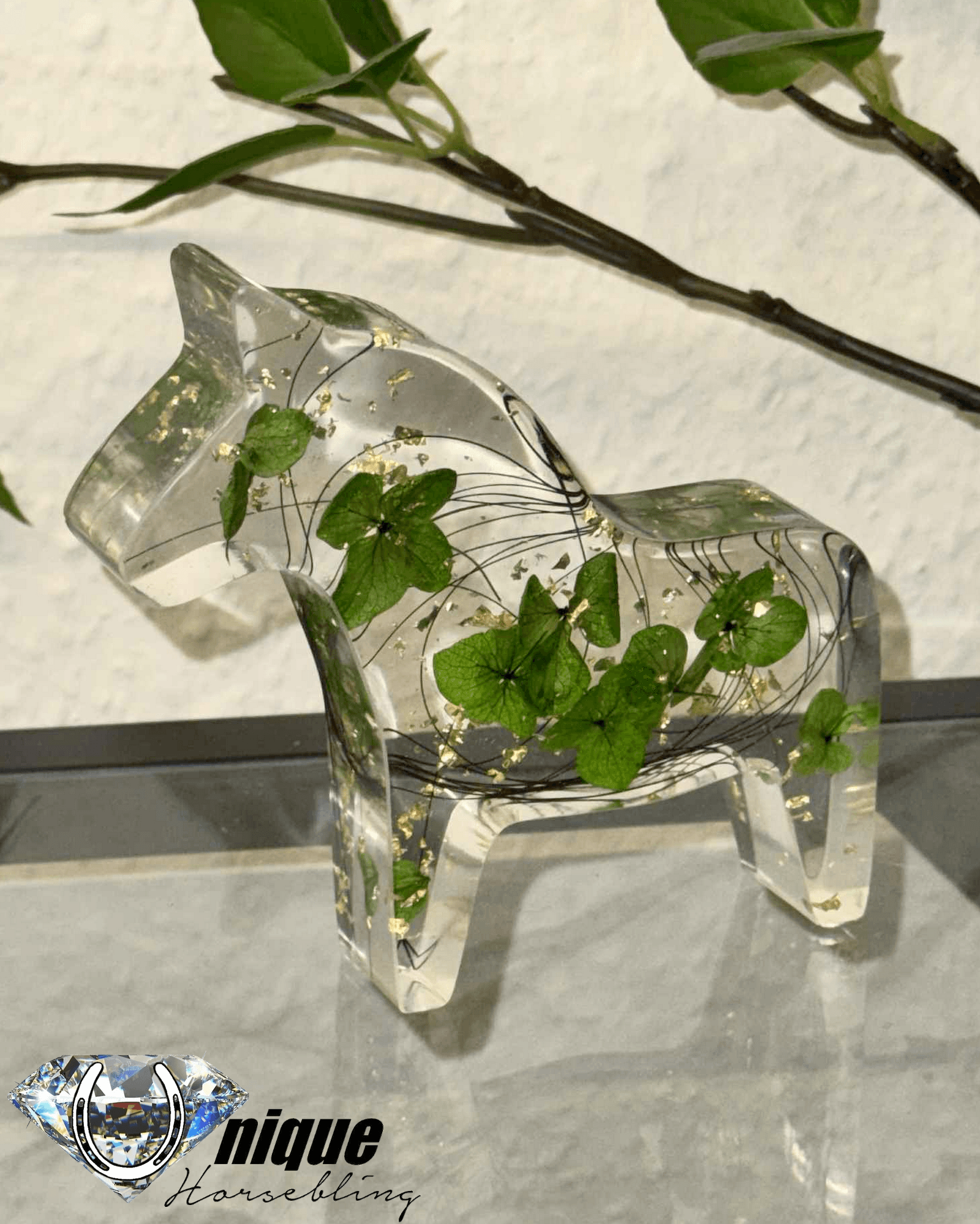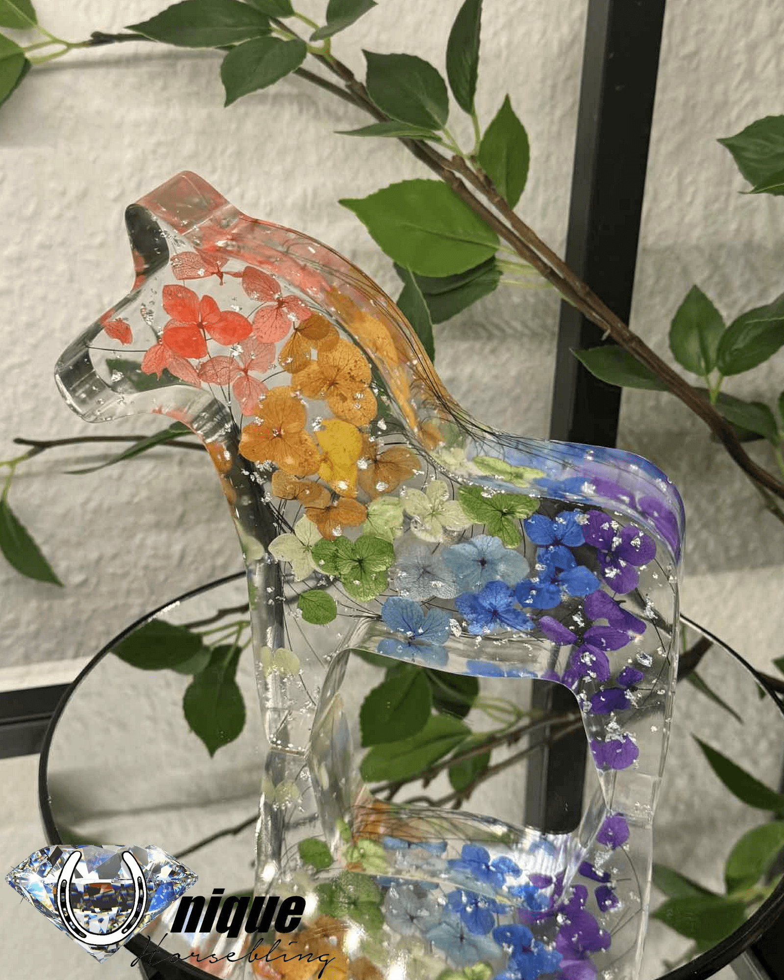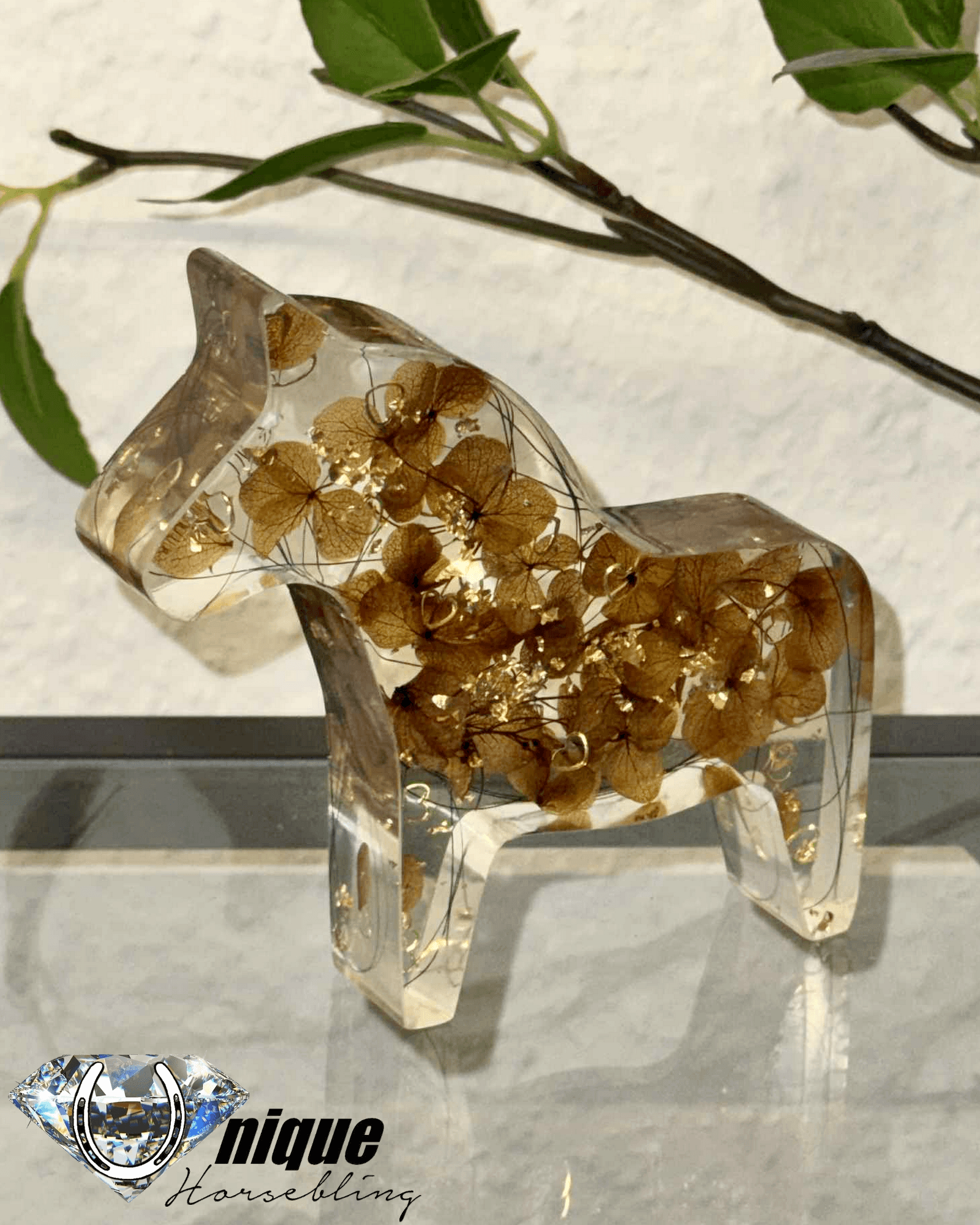 Hår/aske indstøbes i hesteform i den størrelse du har valgt, inden i fordeles hårstrå så jævnt som muligt, det er muligt at tilvælge blomster samt bladguld, bladsølv eller bladkobber samt et væld af metalfolie farver.