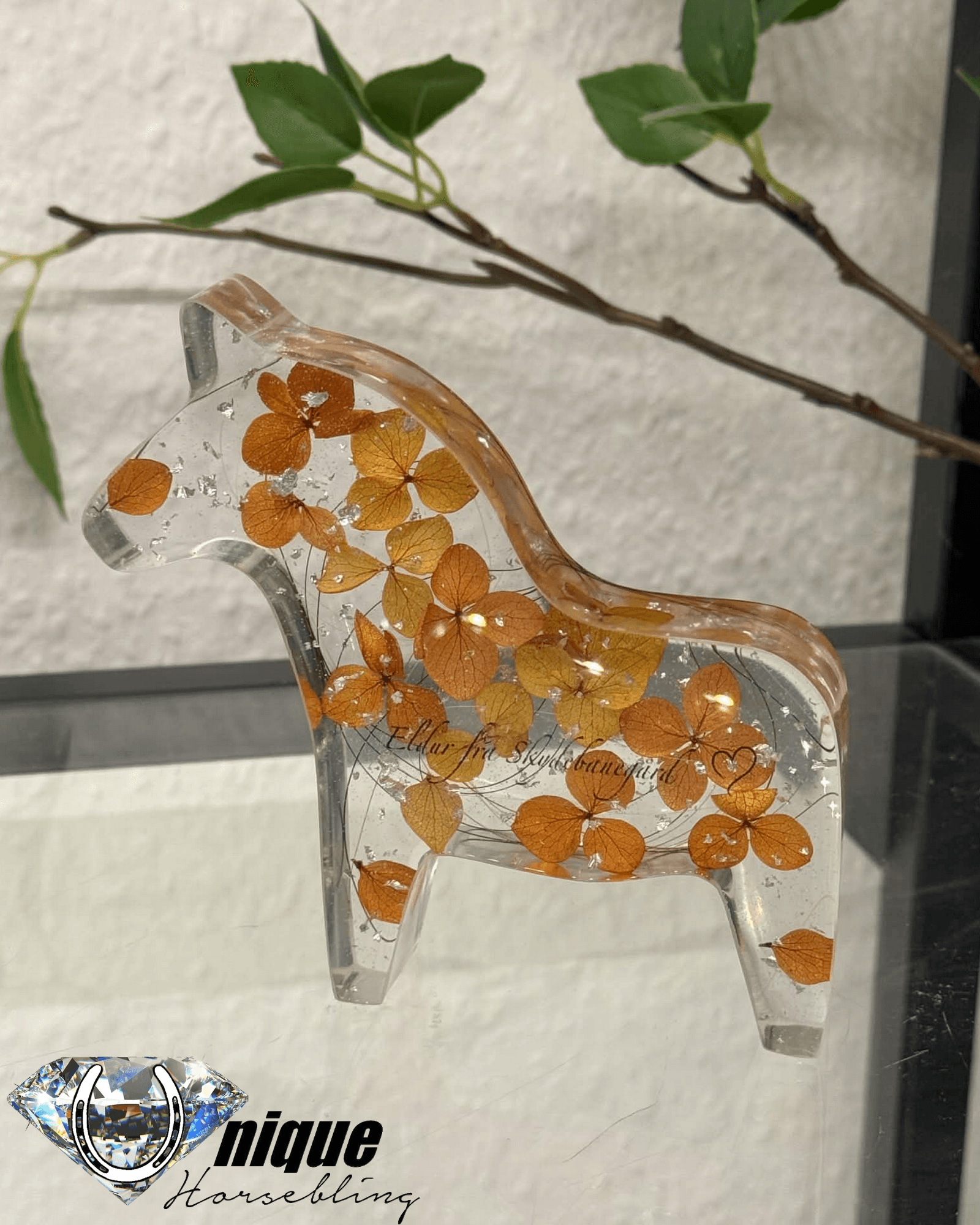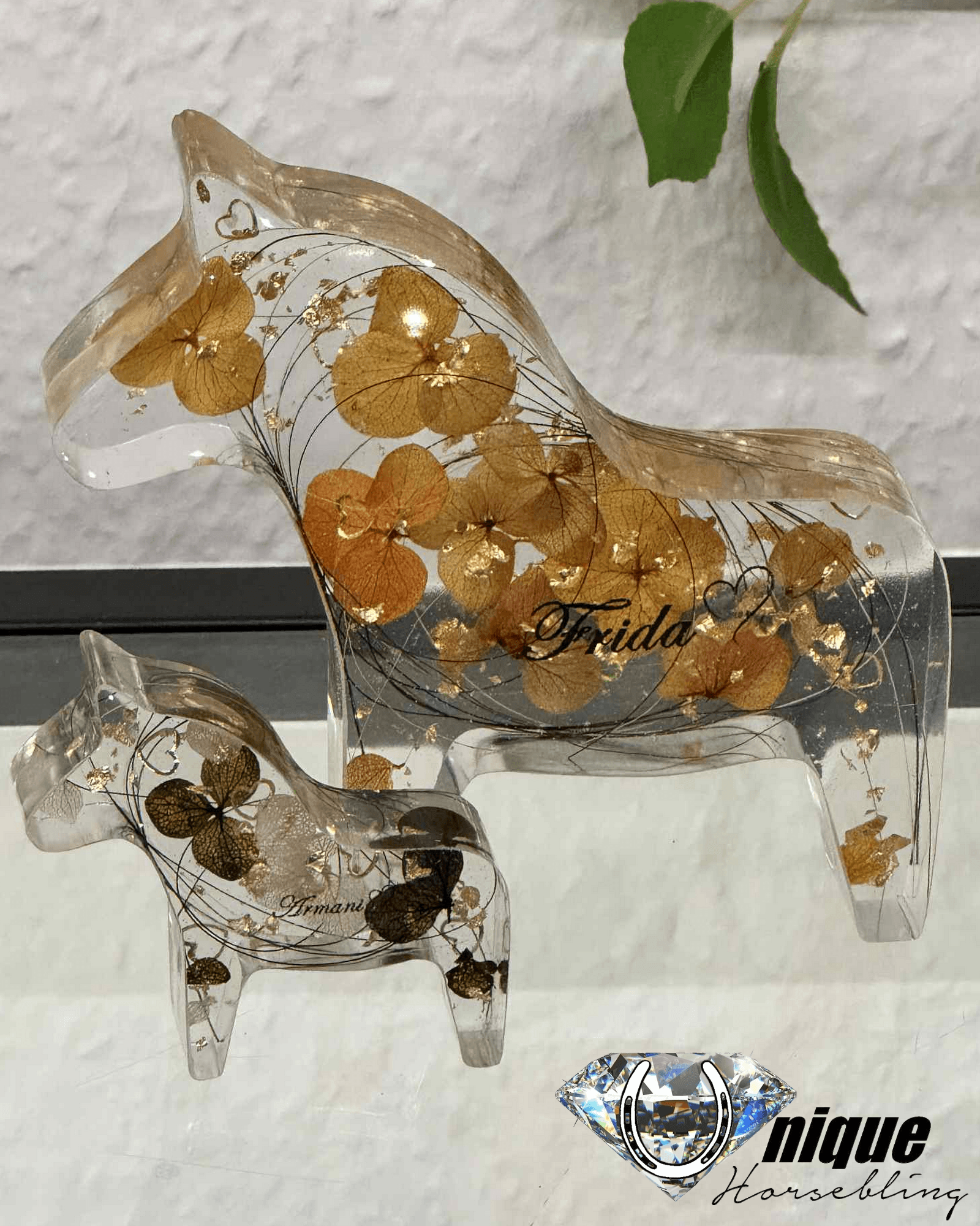 Heste figuren kan du få lavet i 3 forskellige størrelser, de laves med indstøbt hår/aske fra din hest eller pony eller blot stå som symbol på den hest, du har kær – en stilren og meningsfuld måde at bevare minderne på.
