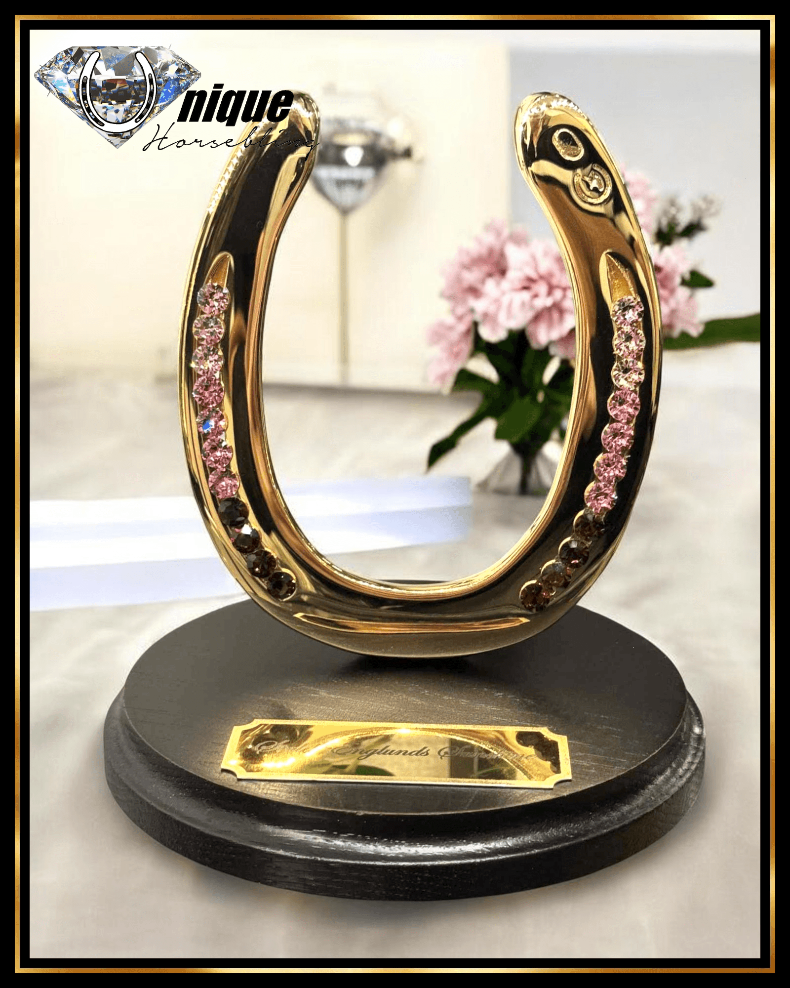 Industrielt 24 karat guldbelagt hestesko, udsmykket med store rhinsten af højeste kvalitet i valgfrie farver, monteret i ramme med graveret skilt.