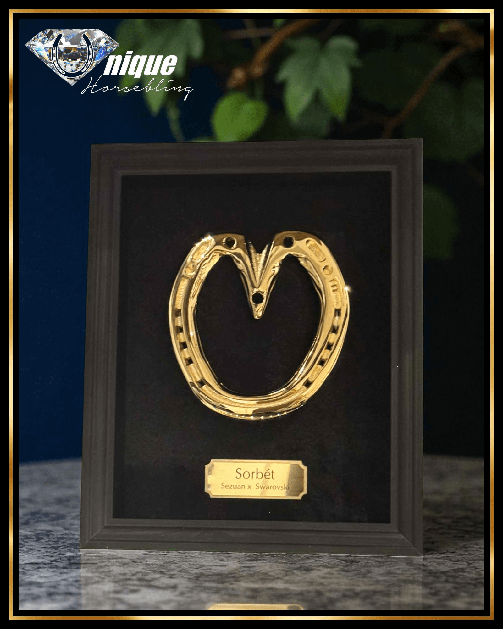 Guldsmede belagt hestesko med 24 karat guld, monteret i ramme med graveret skilt.