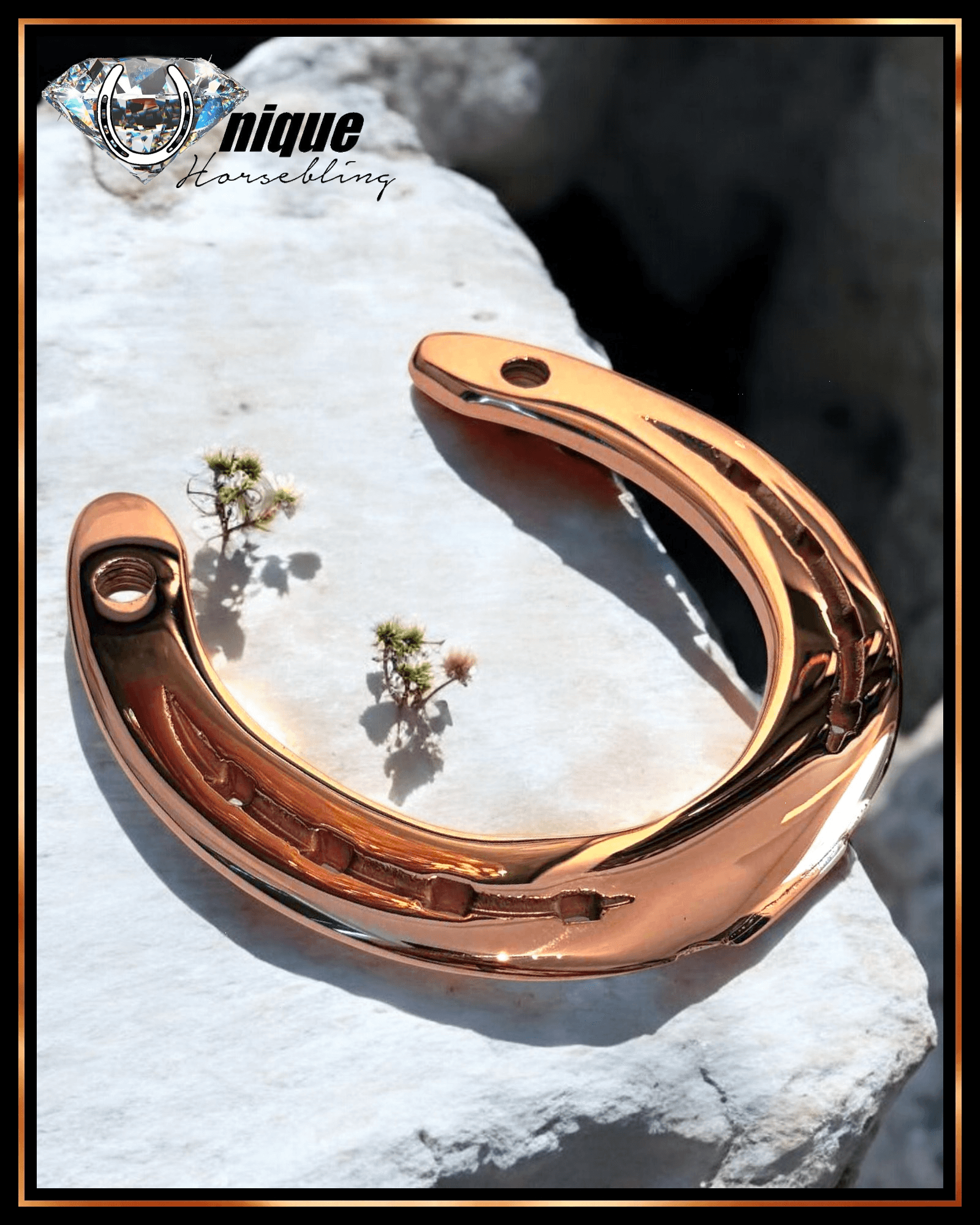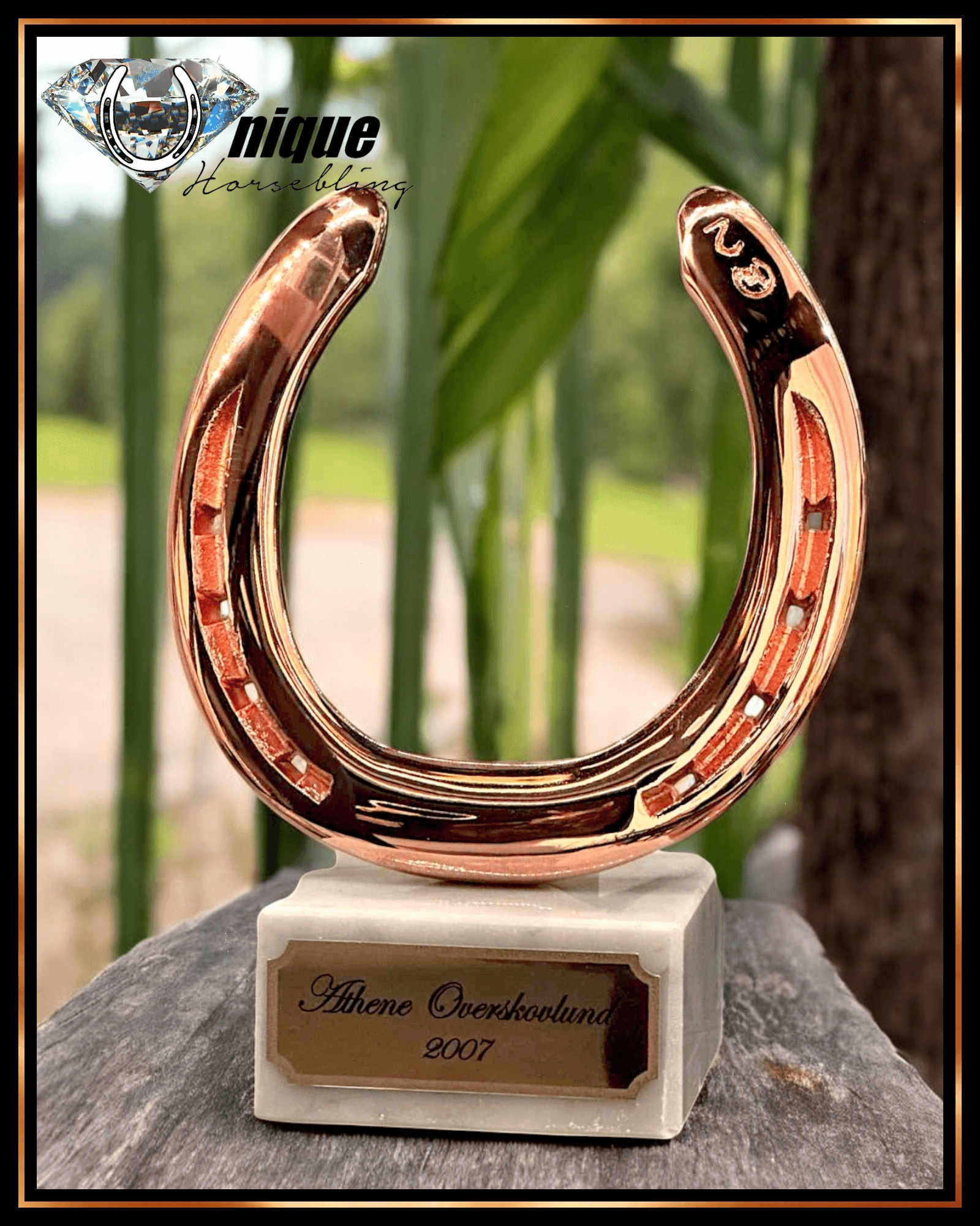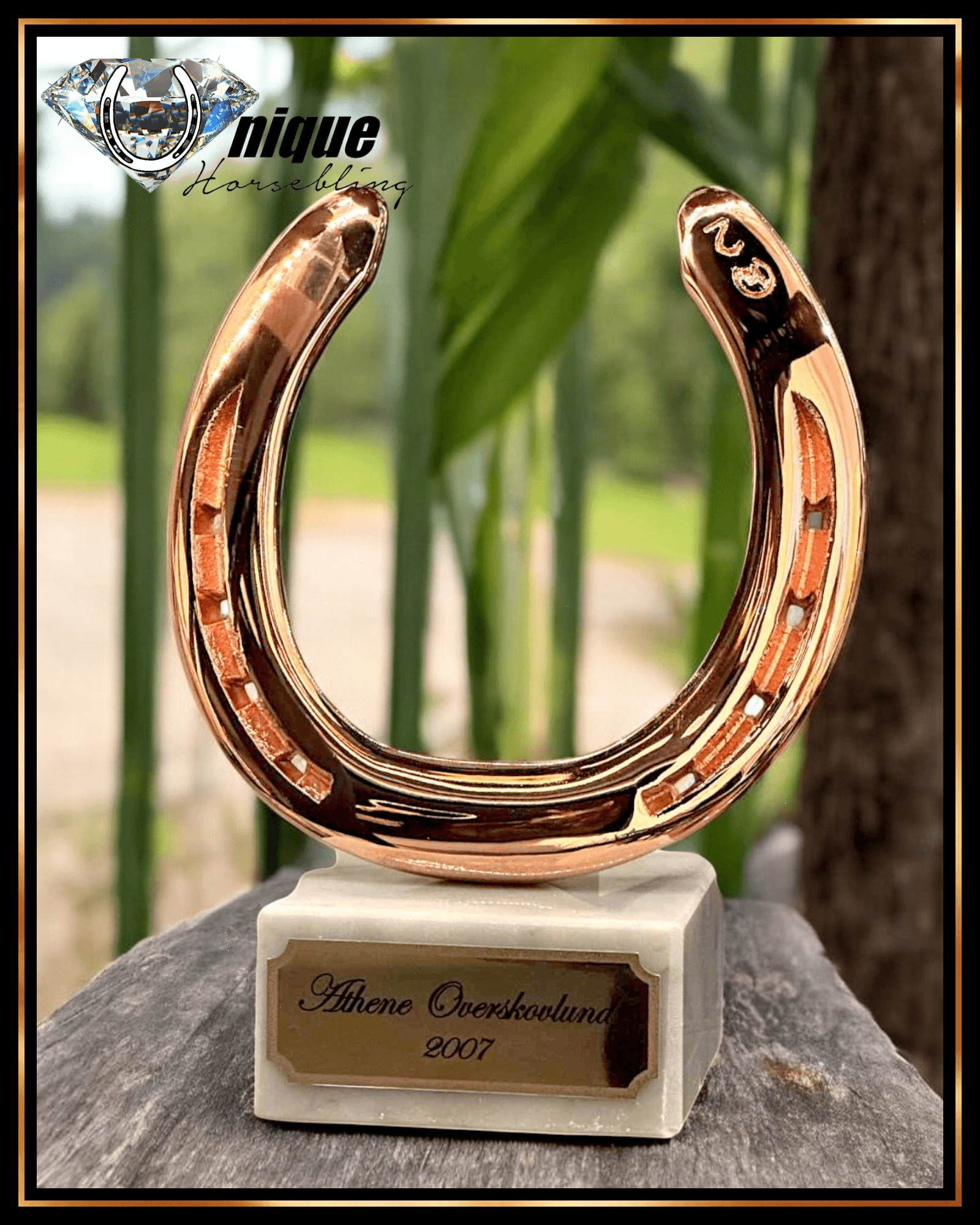 Spejlblank hestesko industrielt belagt med ægte kobber, placeret på en marmorfod med graveret skilt.