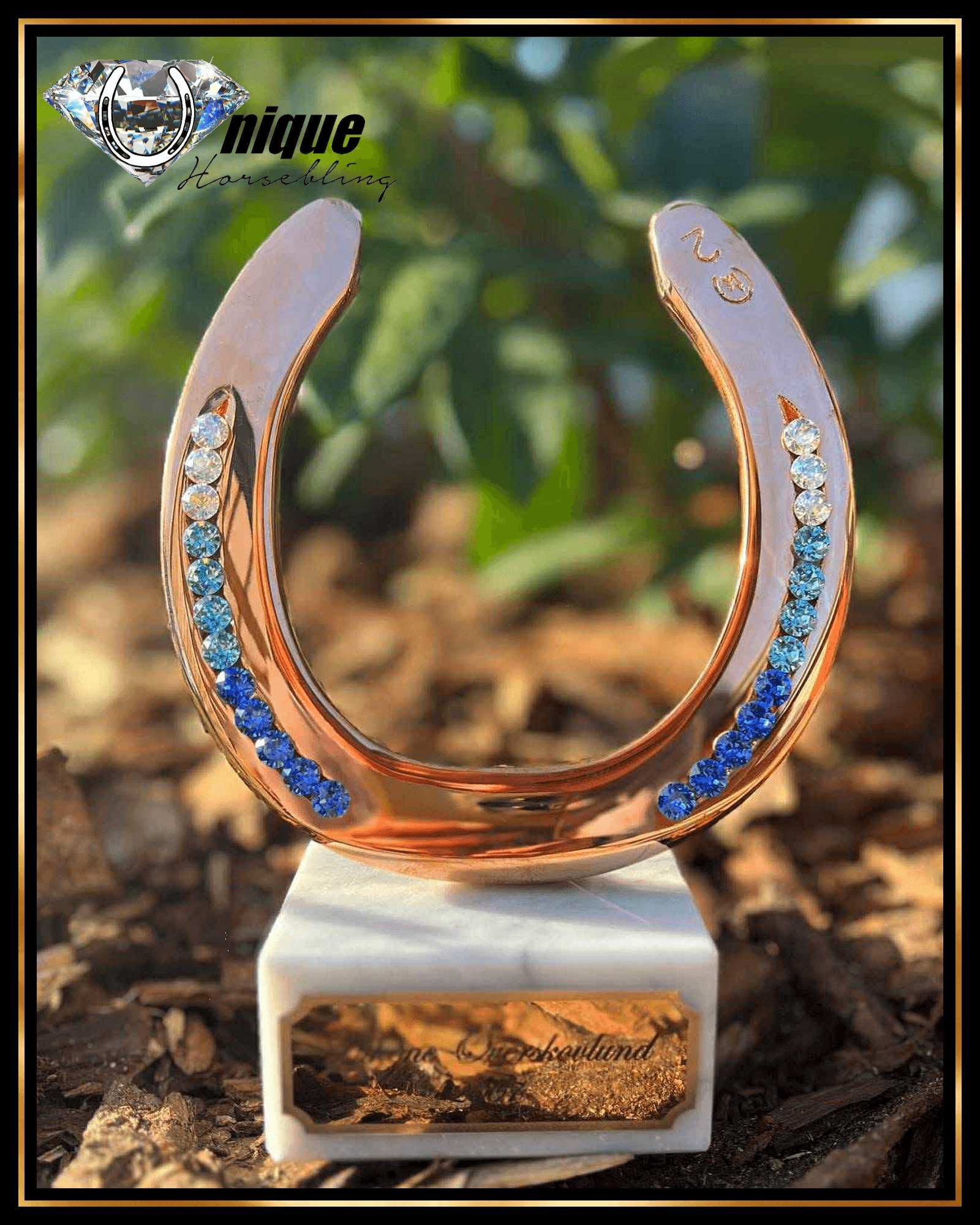 Industrielt kobberbelagt hestesko, udsmykket med store rhinsten af højeste kvalitet i valgfrie farver, monteret i ramme med graveret skilt.