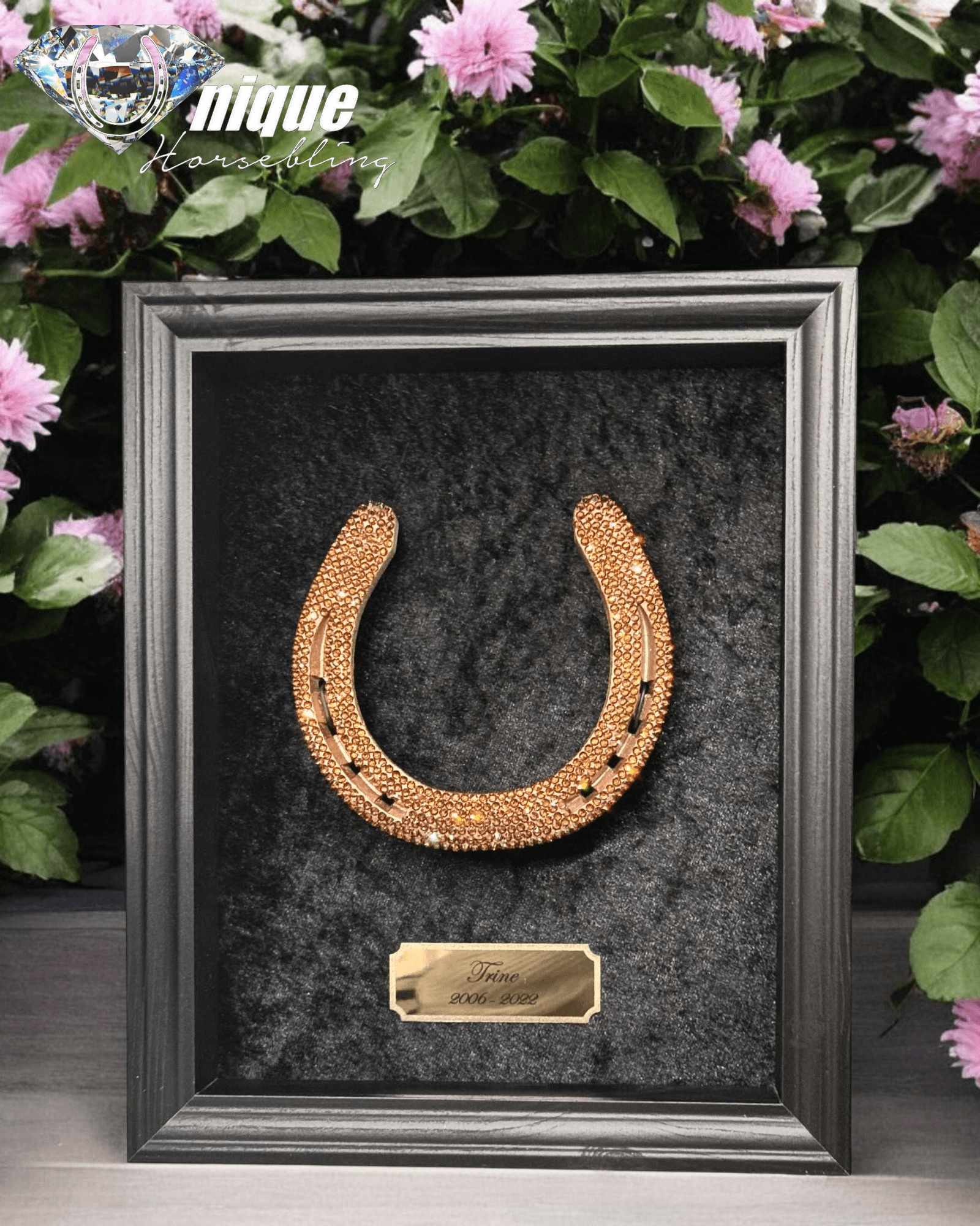 Den færdig udsmykkede hestesko monteres i en smuk elegant ramme.