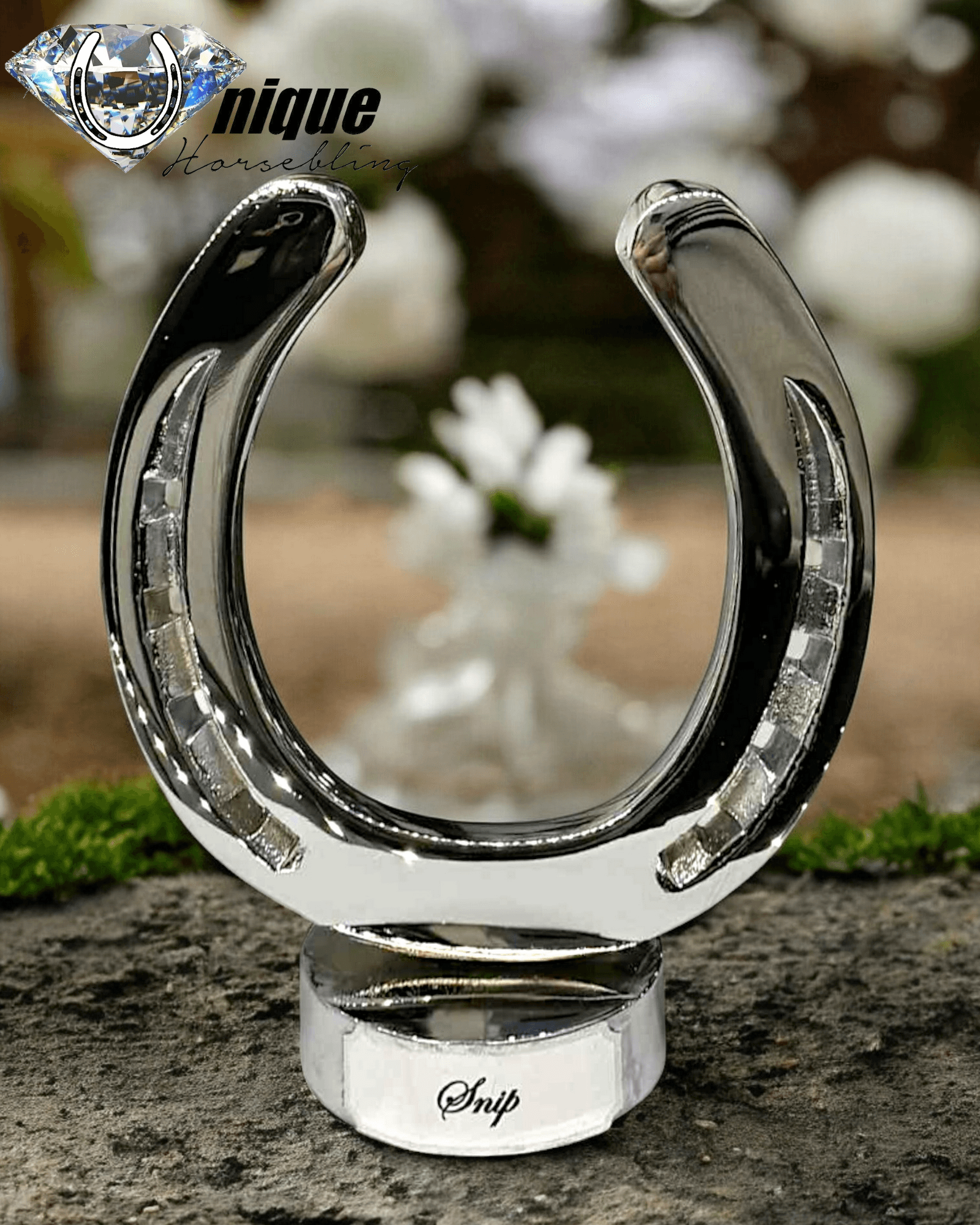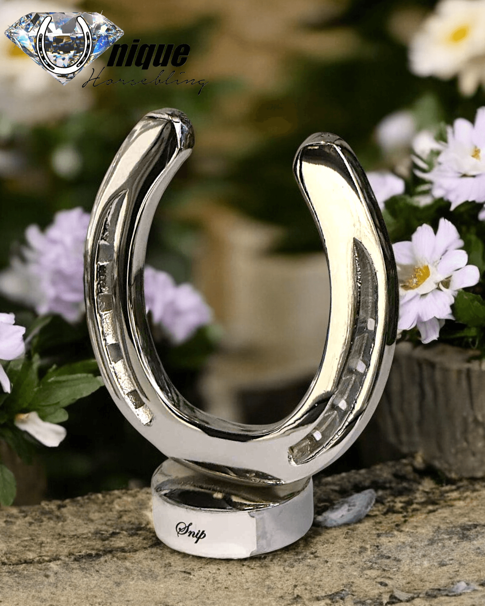 Vi tager din brugte hestesko og omdanner den til et smukt, spejlblankt design på rund metalfod.