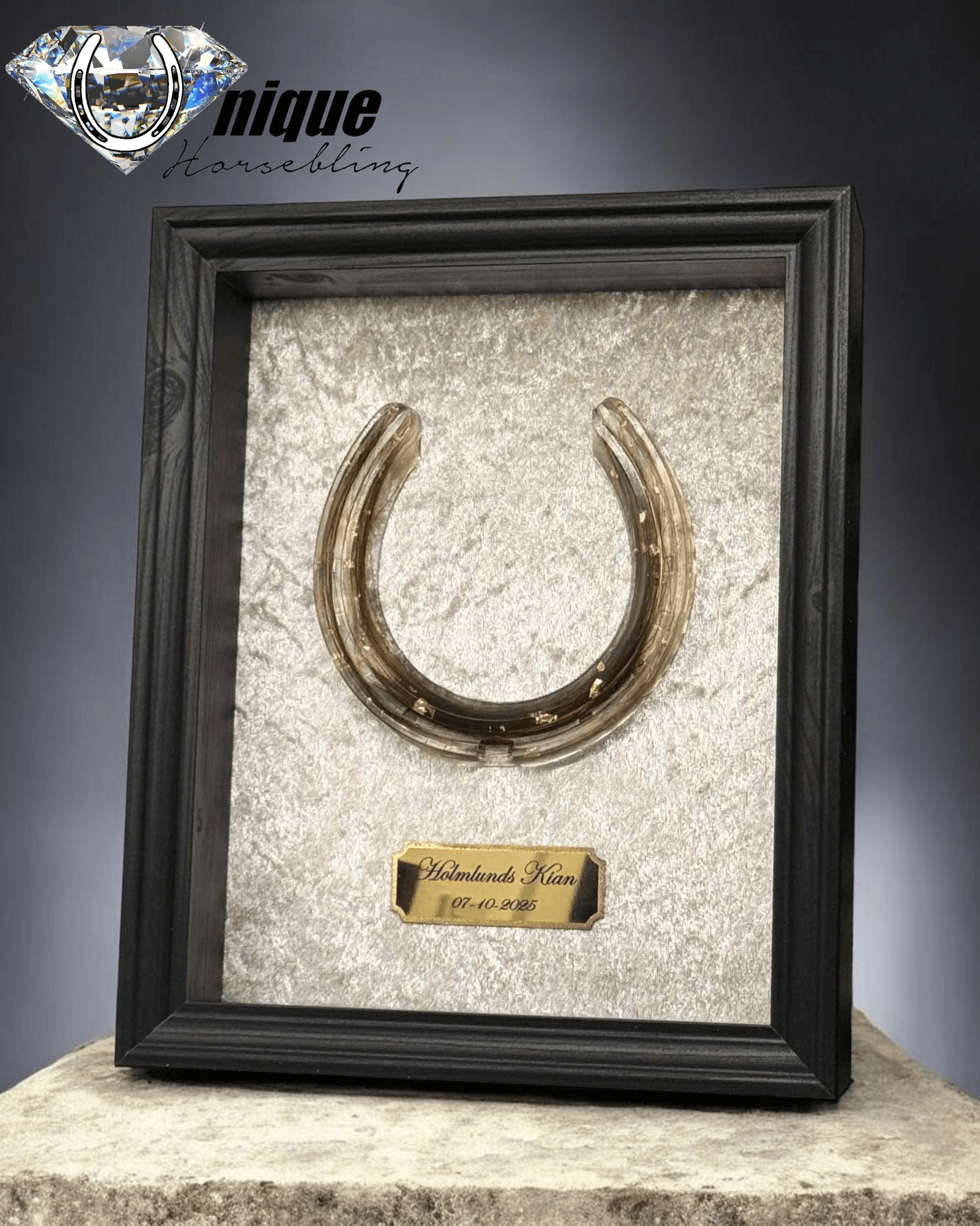 Hesteskoen monteres i en elegant ramme med valgfri baggrund.