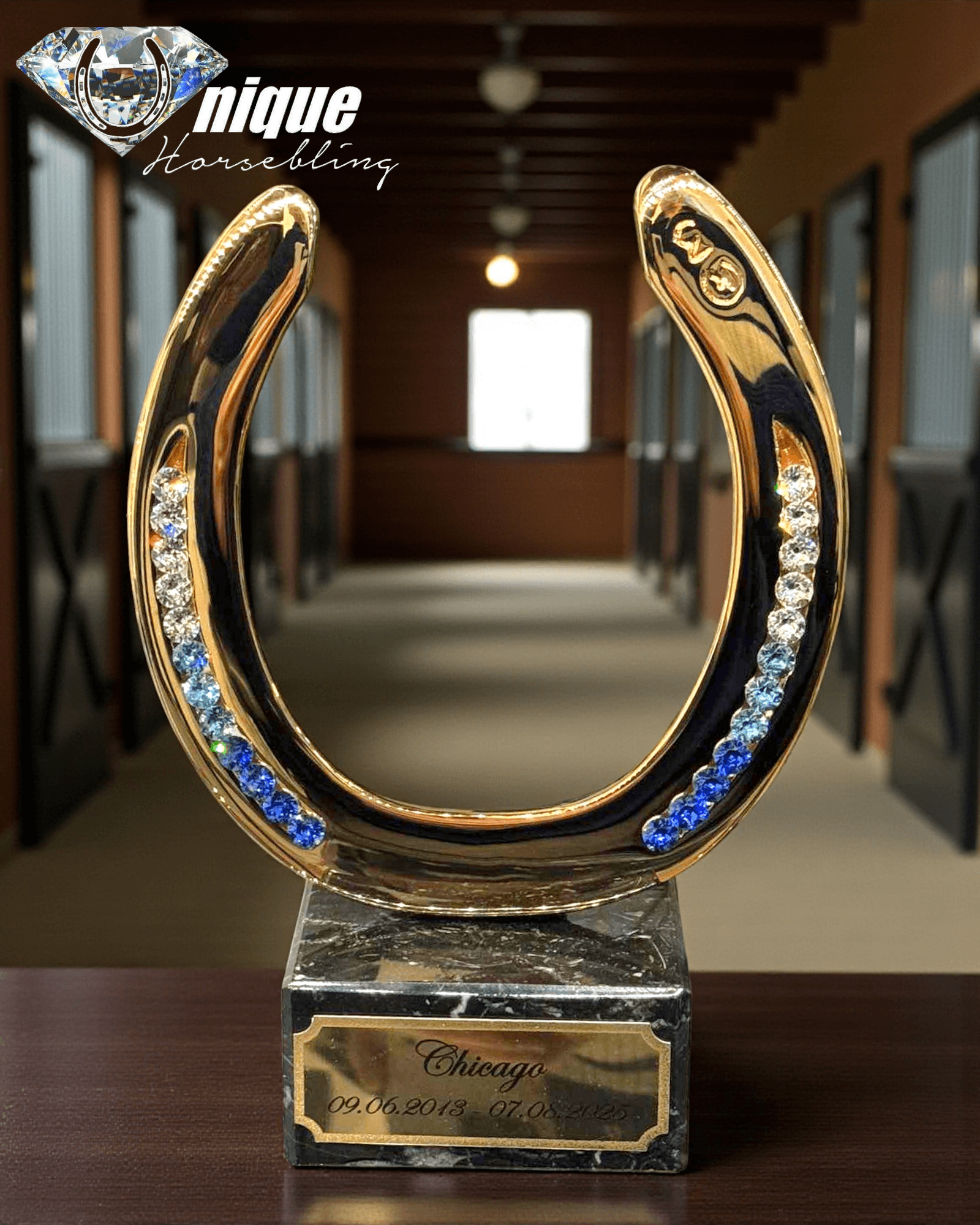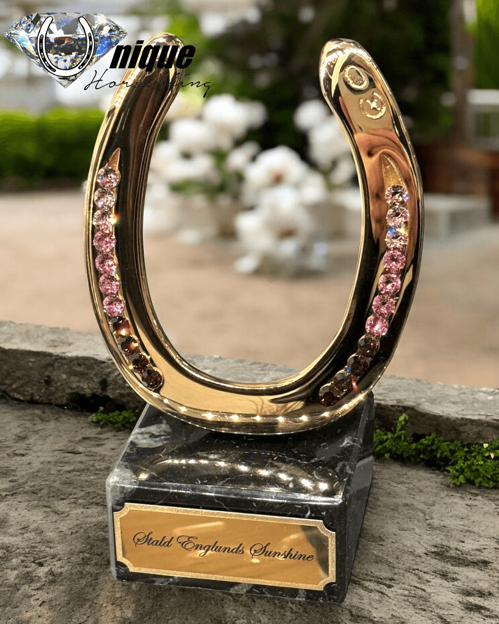Vi forvandler din egen brugte hestesko til et smukt og spejlblankt kunstværk, industrielt belagt med ægte 24 karats guld og udsmykket med funklende store rhinsten i sømrillerne.