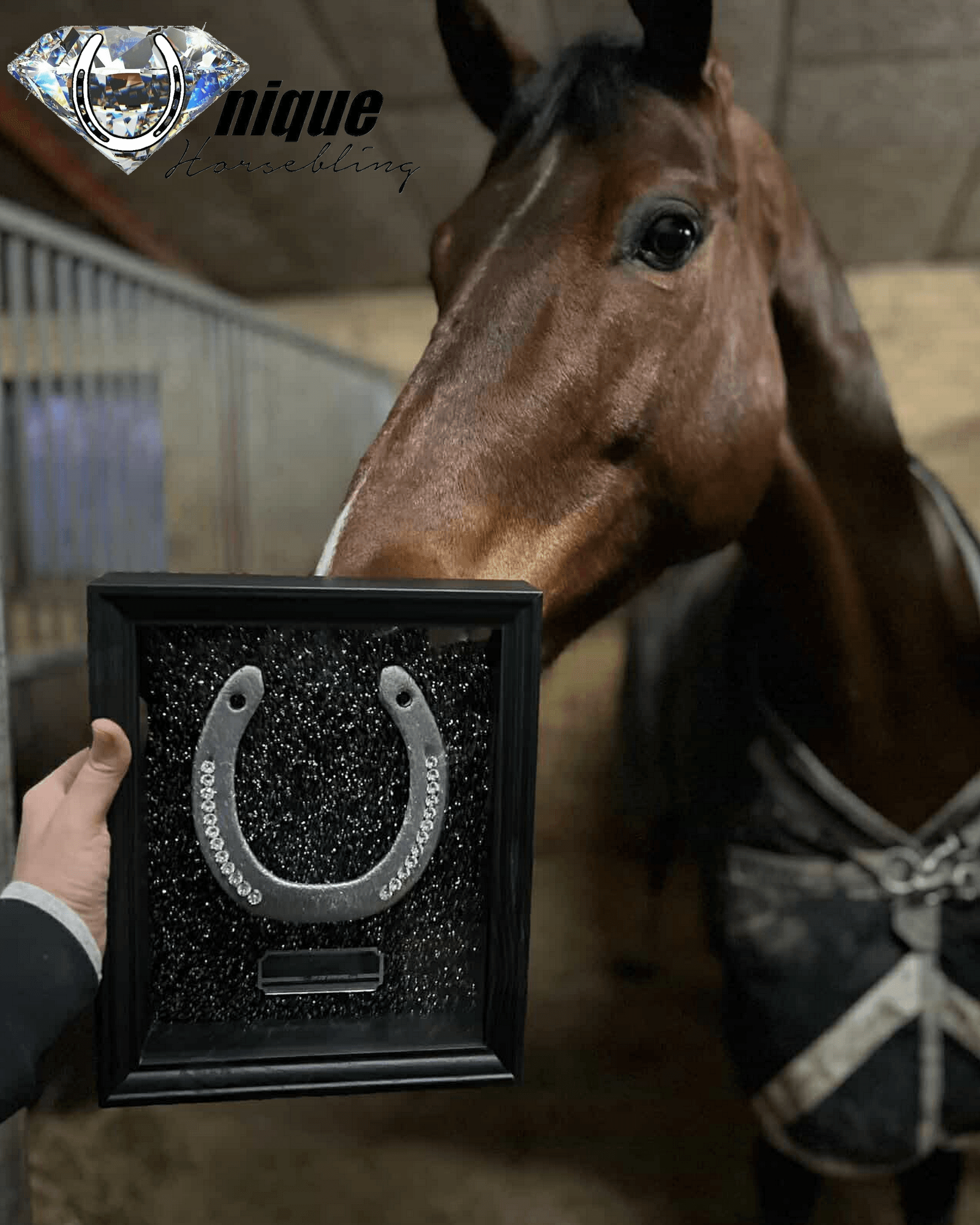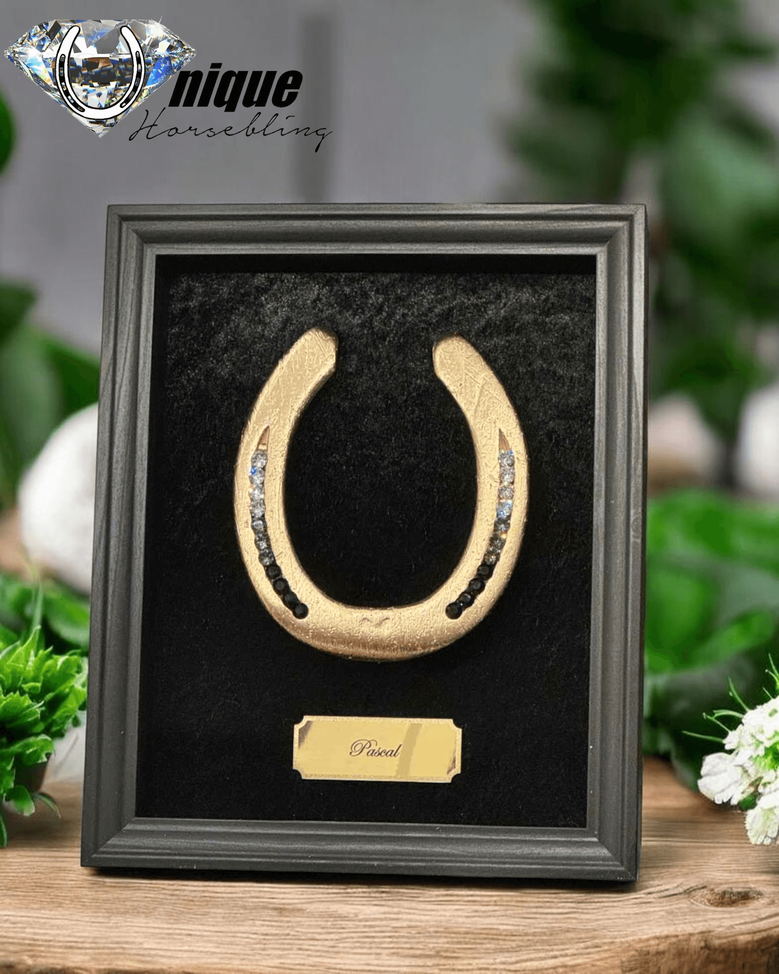 Den færdig udsmykkede hestesko monteres i en elegant ramme med valgfri baggrund.