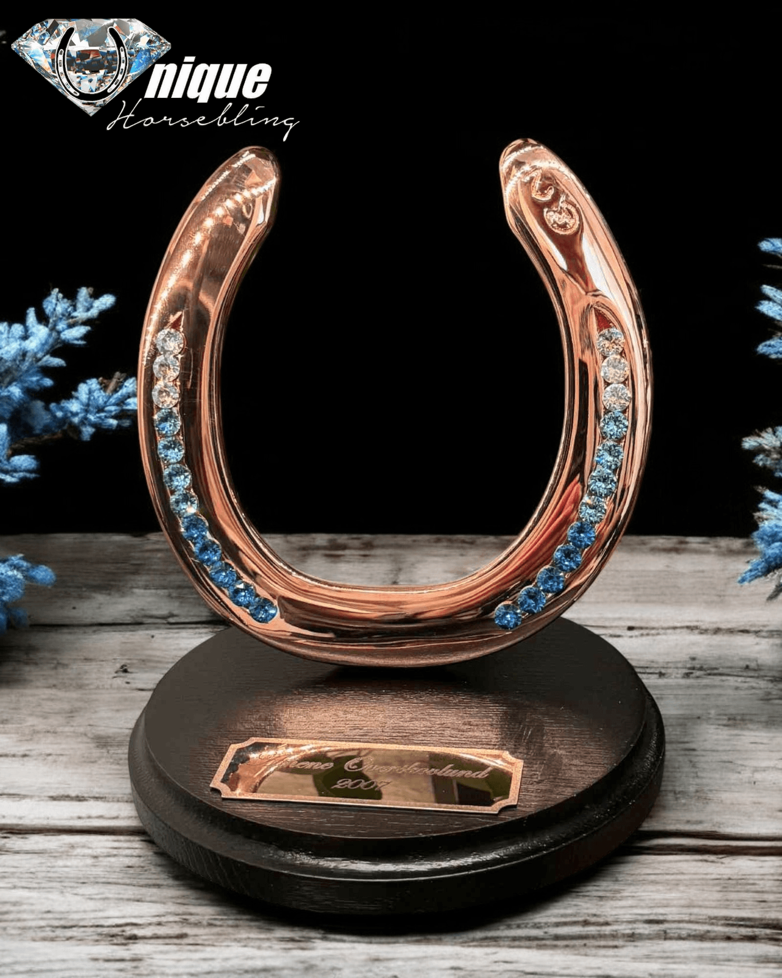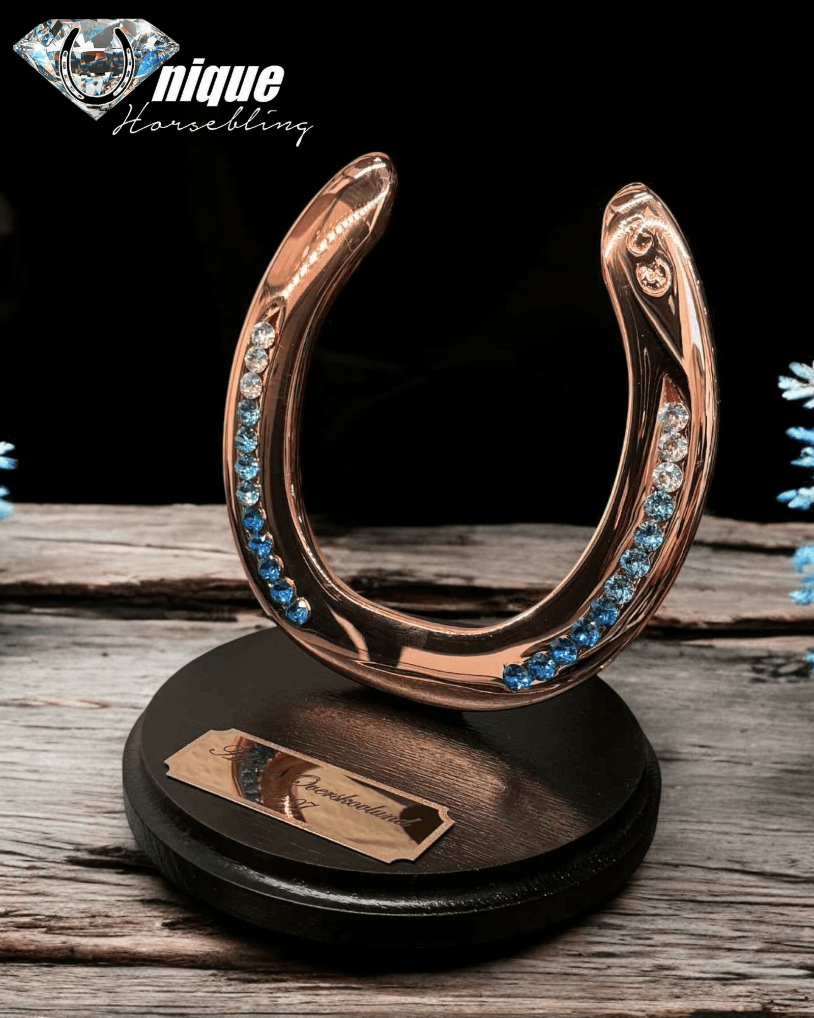 Slutresultatet er en eksklusiv og elegant hestesko, som du bogstaveligt talt kan spejle dig med sten som glimter om kap med solen, den færdige hestesko monteres på en smuk rund massiv egetræs plade.