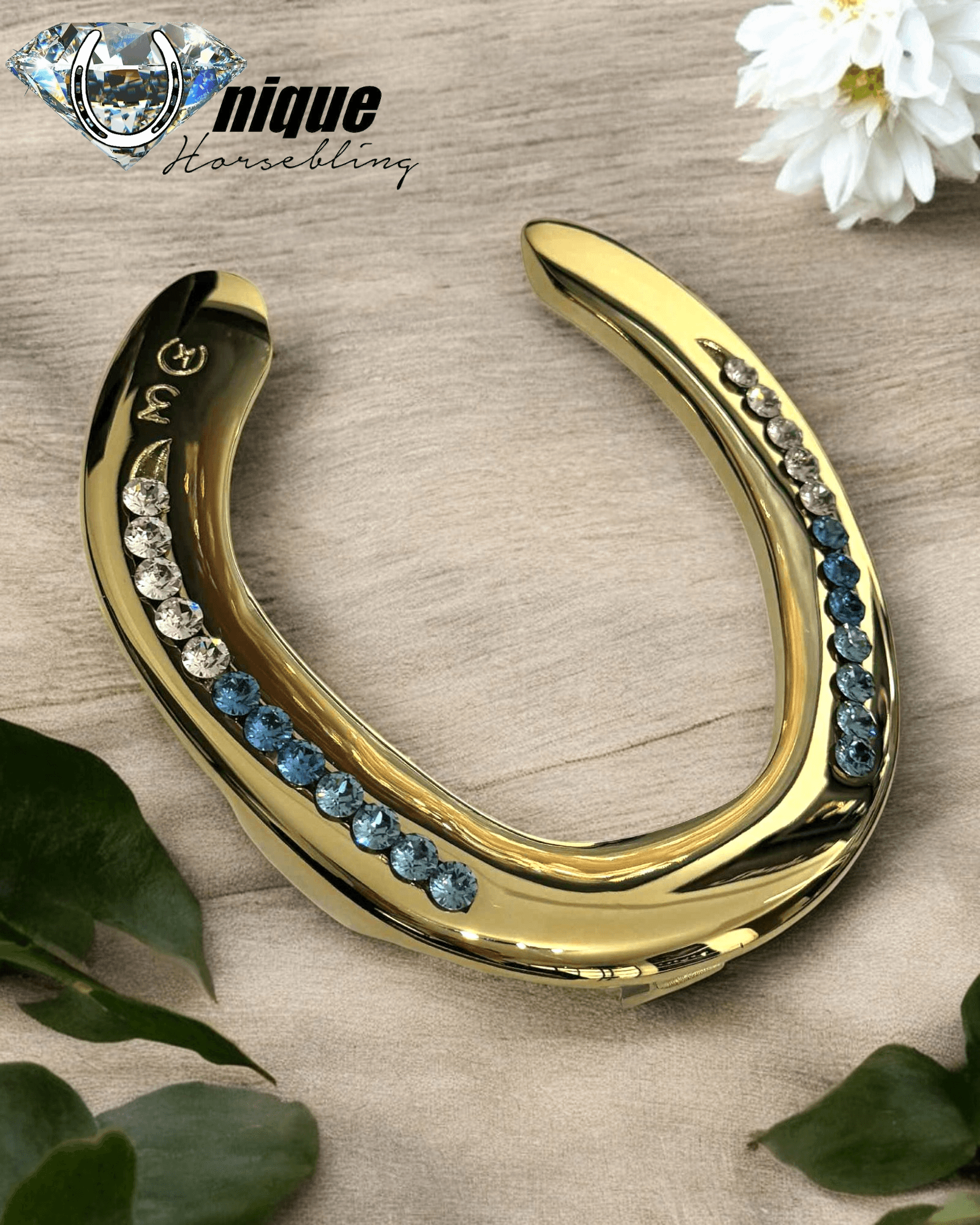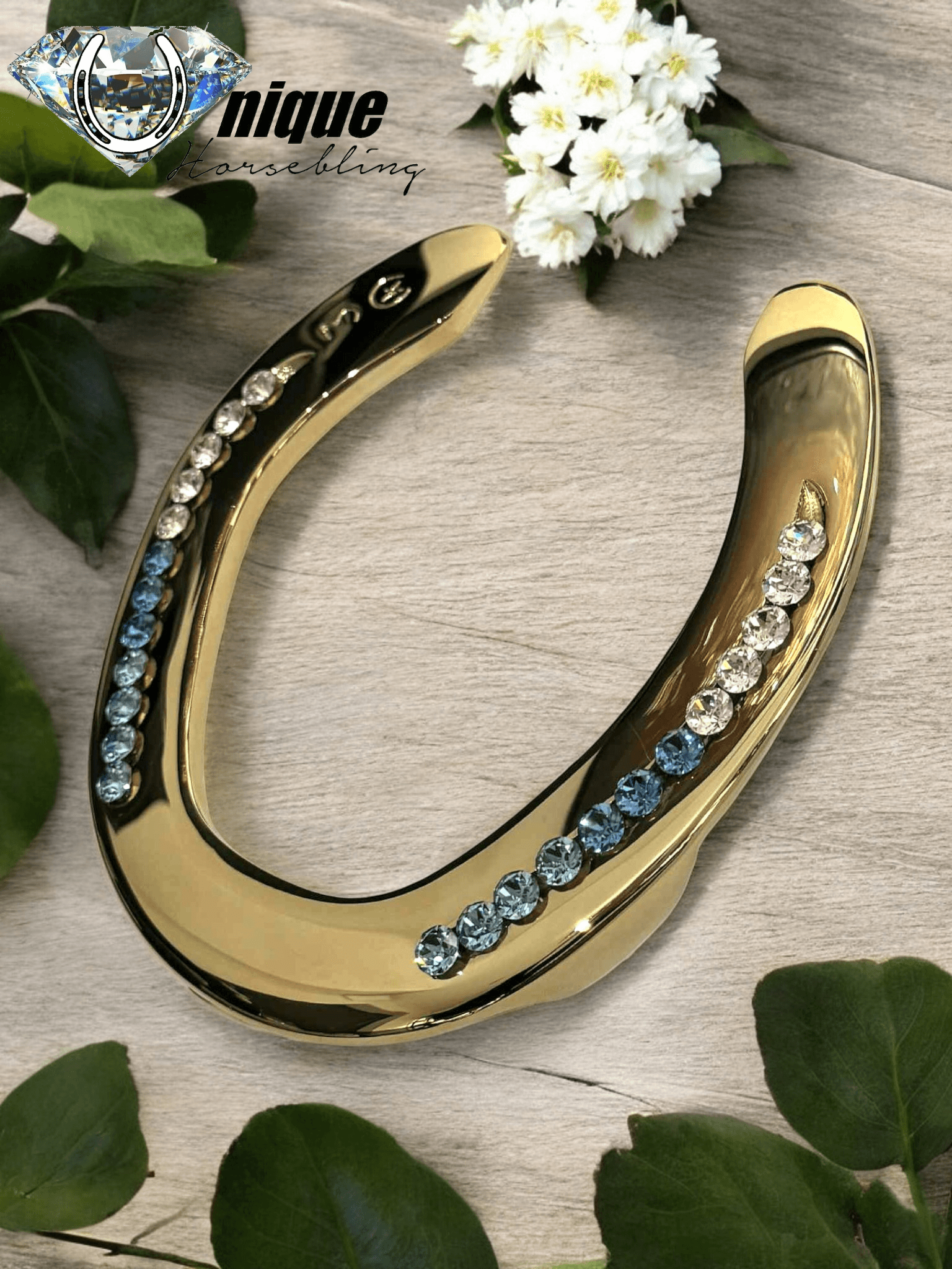 Vi forvandler din egen brugte hestesko til et smukt og spejlblankt kunstværk, industrielt belagt med ægte messing og udsmykket med funklende store rhinsten i sømrillerne.