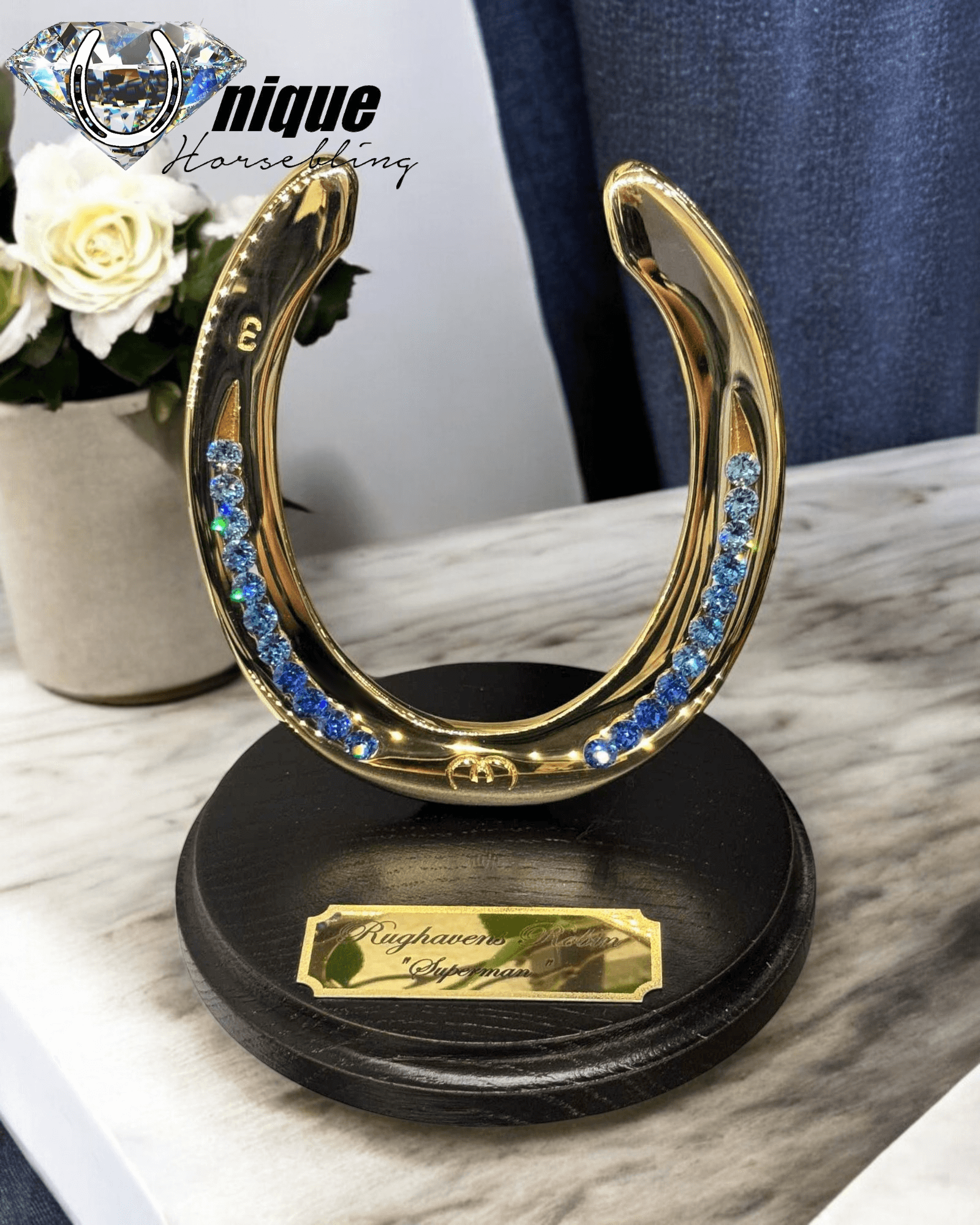 Slutresultatet er en eksklusiv og elegant hestesko, som du bogstaveligt talt kan spejle dig i og som kirsebærret på toppen er de store funklende rhinsten af højeste kvalitet der monteres i sømrillerne, den færdige hestesko monteres på en smuk rund massiv egetræs plade.