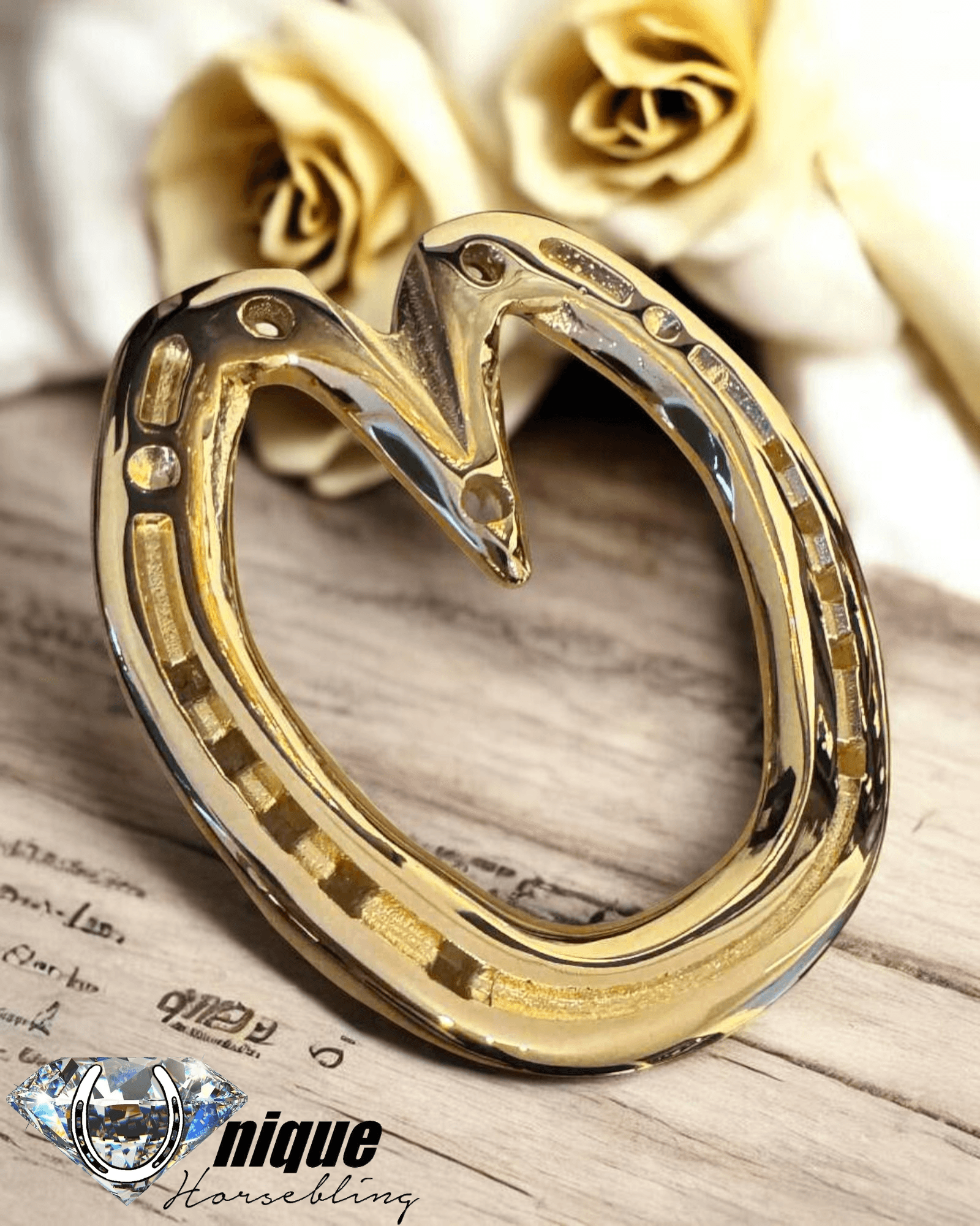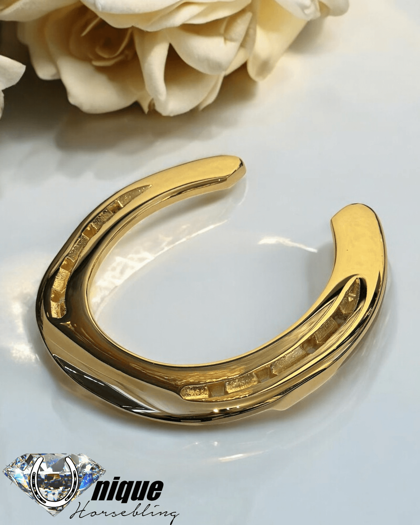 Vi forvandler din egen brugte hestesko til et smukt og spejlblankt kunstværk, industrielt belagt med ægte 24 karats guld.
