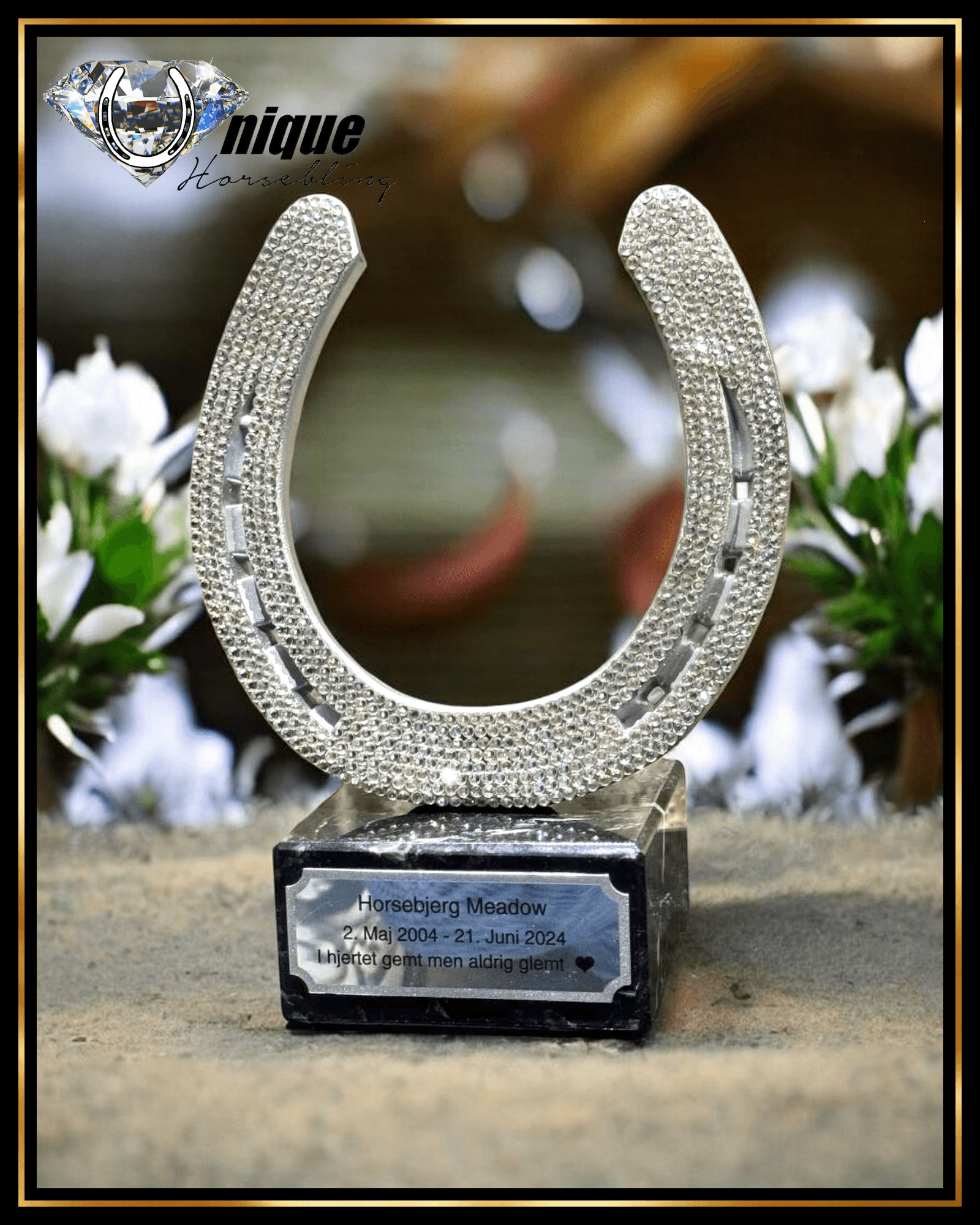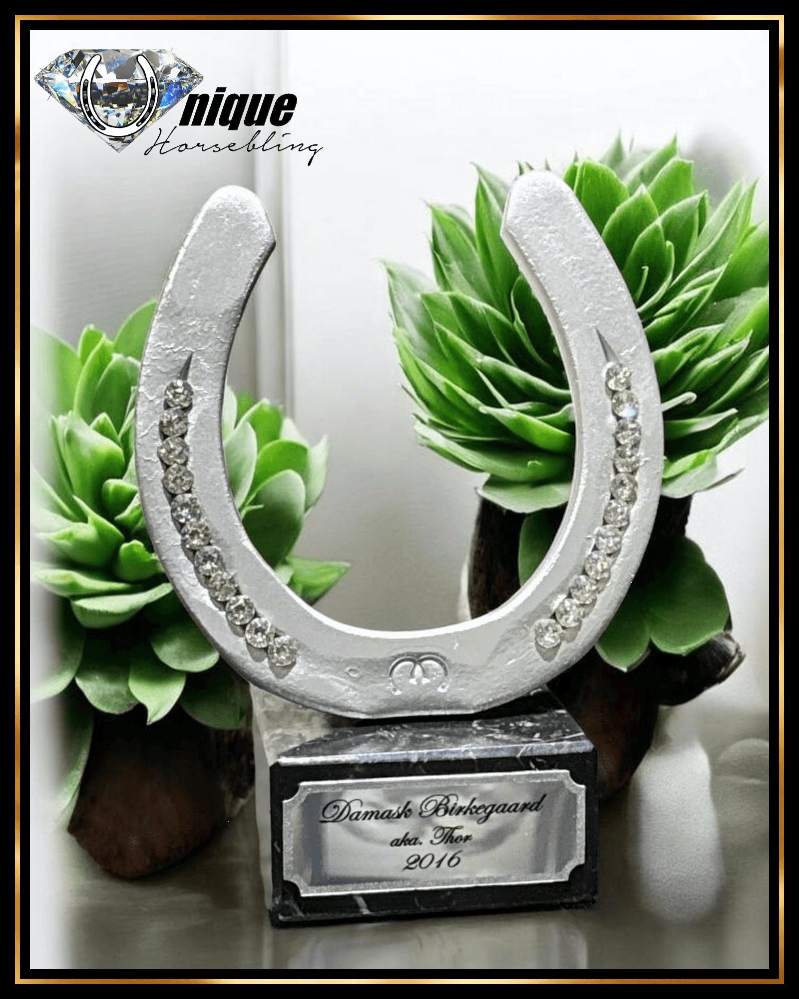 Spejlblank hestesko forkromet, udsmykket med store rhinsten i sømriller, placeret på en marmorfod med graveret skilt.