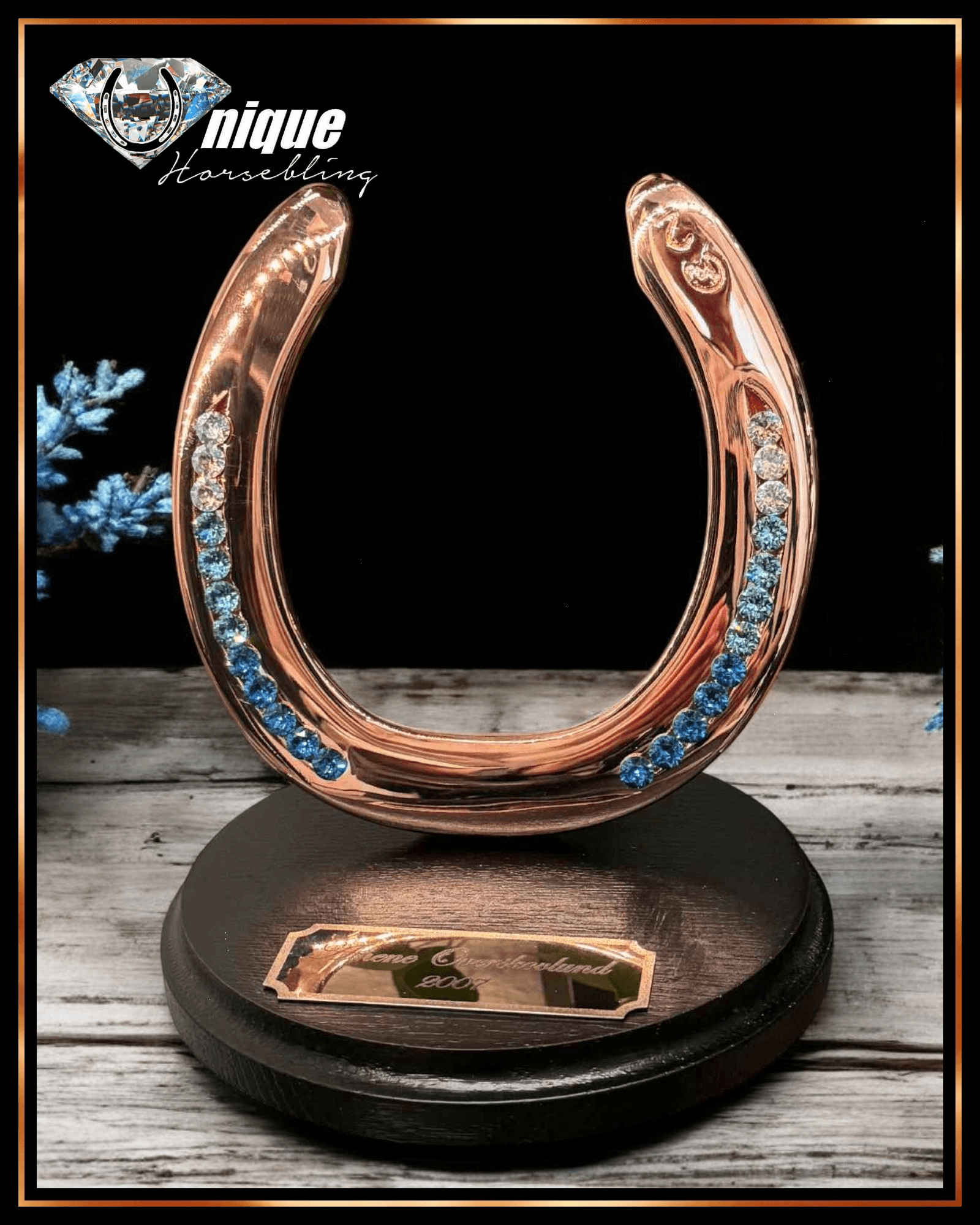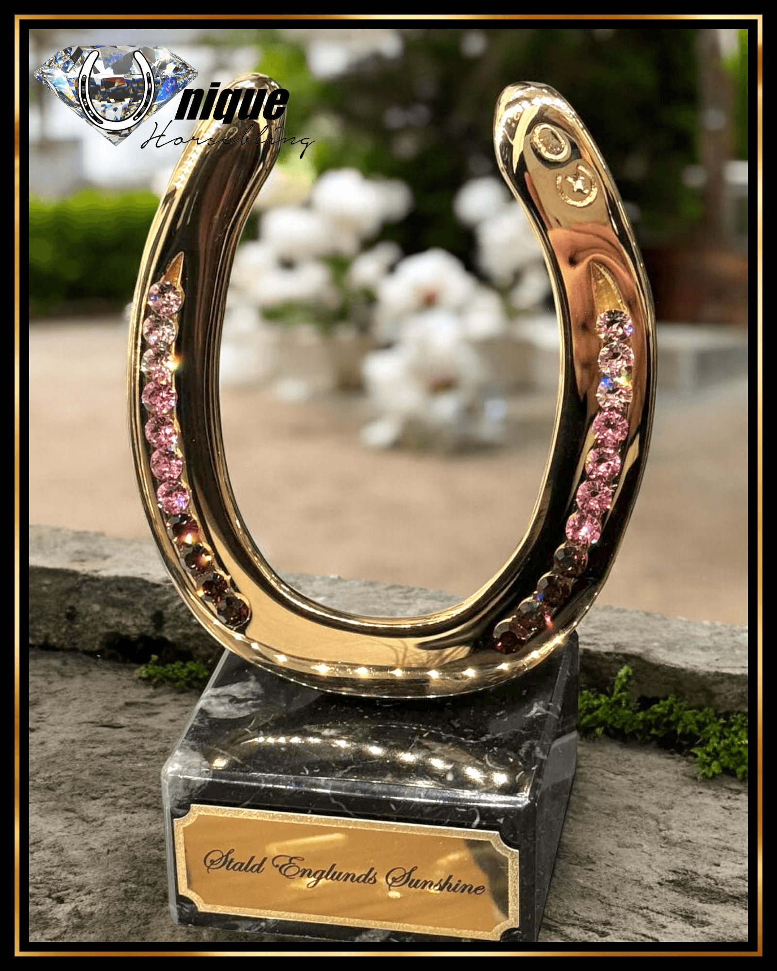 Industrielt 24 karat guldbelagt hestesko, udsmykket med store rhinsten af højeste kvalitet i valgfrie farver, monteret på massiv egetræsplade med graveret skilt.
