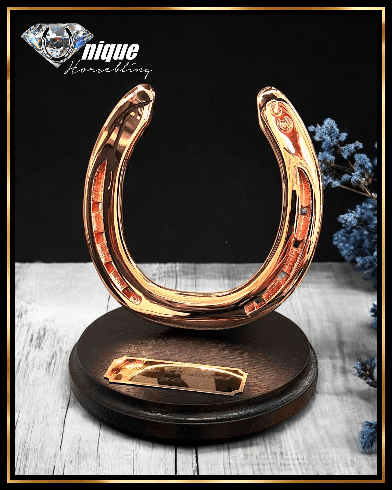 Industrielt 24 karat guldbelagt hestesko, monteret på massiv egetræsplade med graveret skilt.