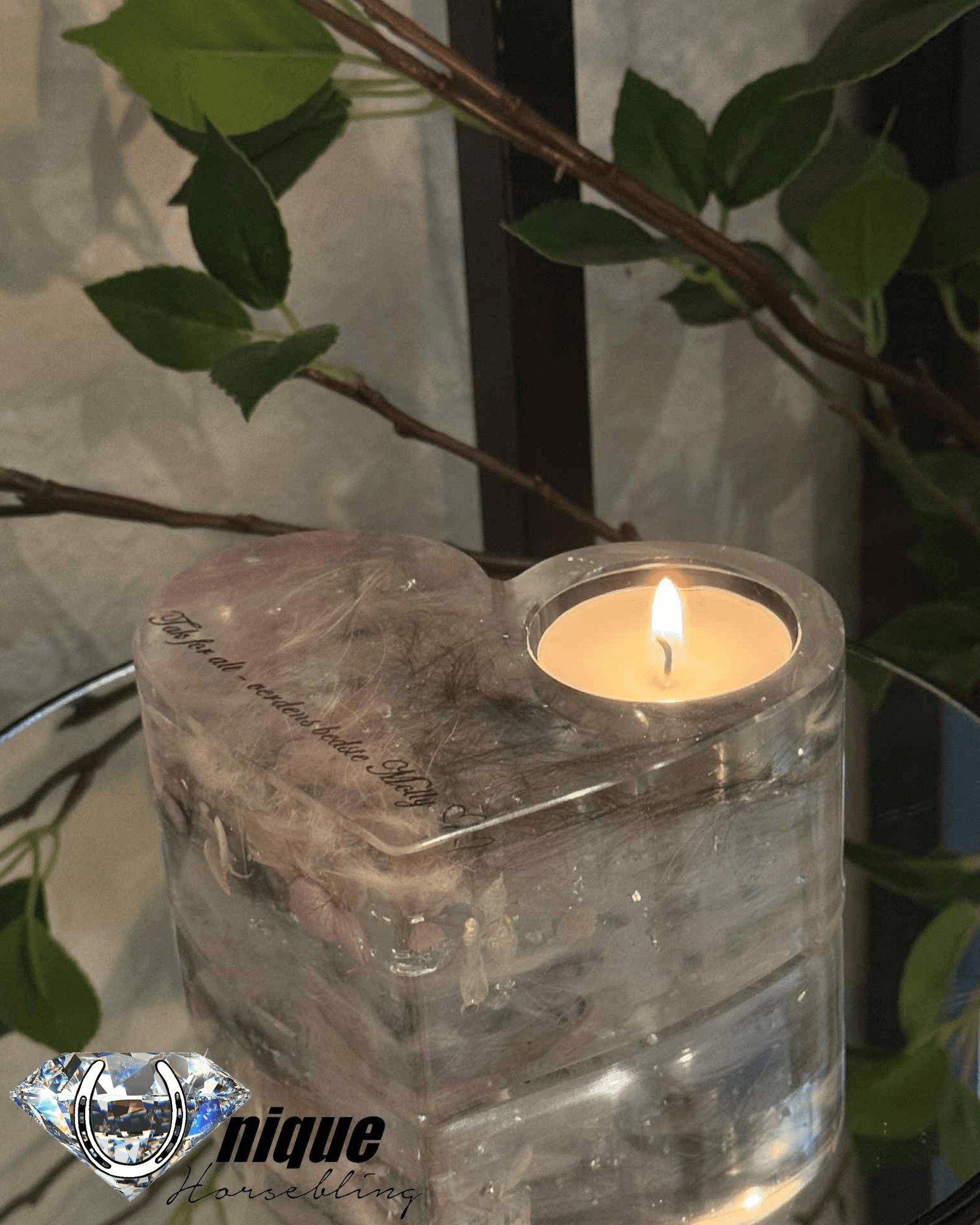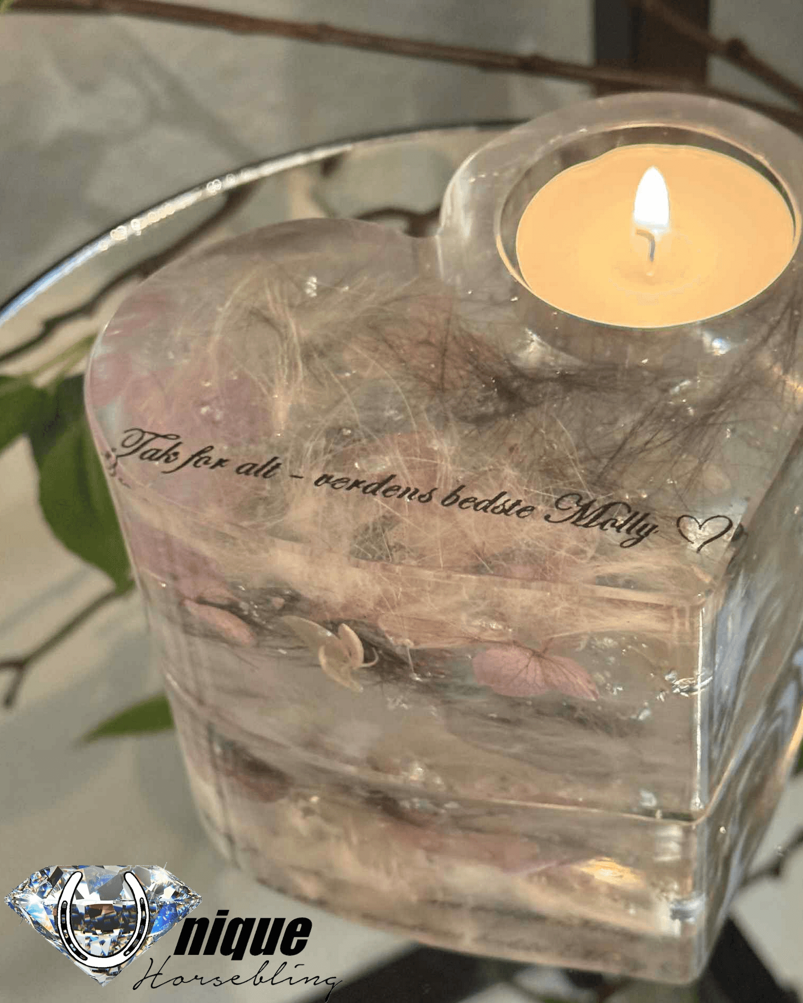 En elegant og høj fyrfadsstage i hjerteform, med rig mulighed for at indstøbe hår, aske, tænder – eller noget helt andet, der har særlig betydning for dig.