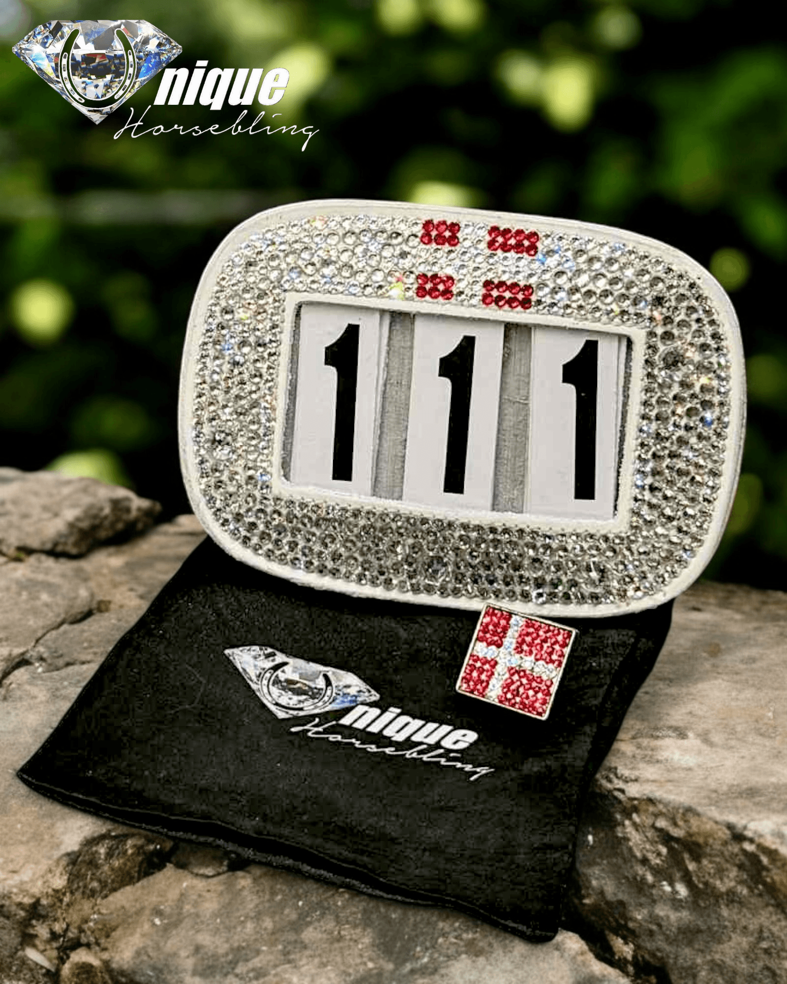 Funklende stævne nummer med rhinsten i højeste kvalitet i ikke mindre end 4-5 forskellige størrelser i valgfri farve, så i kan matche jeres outfit 100%.